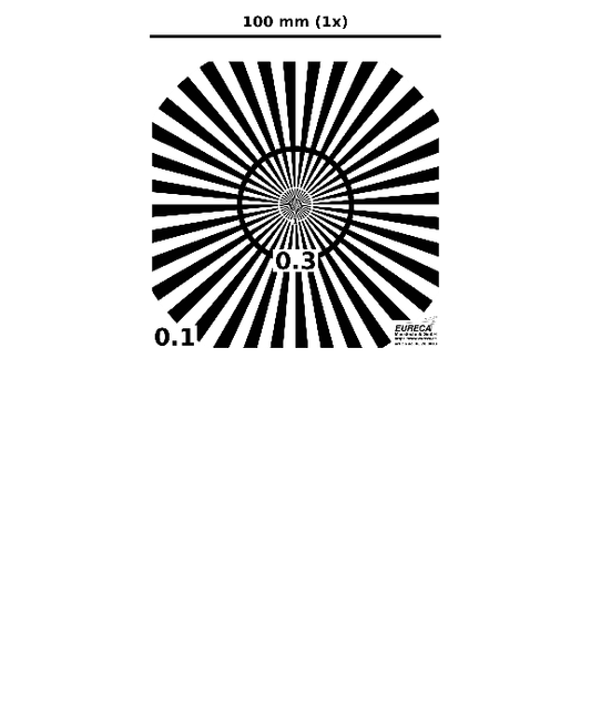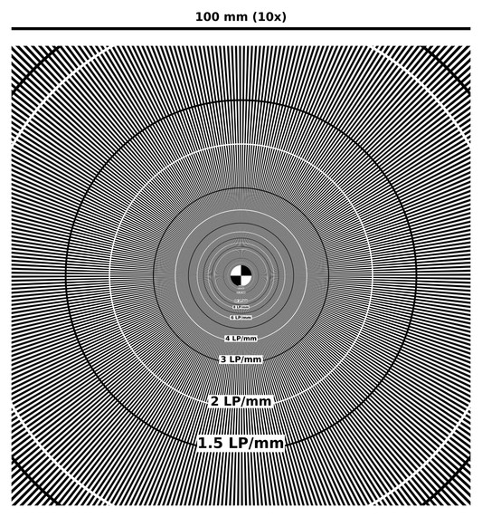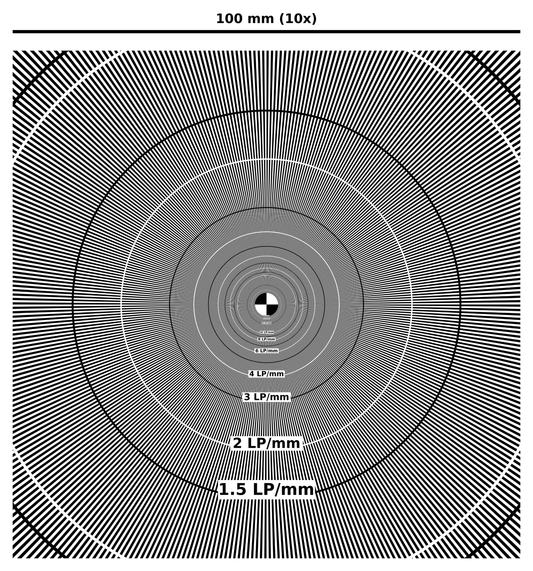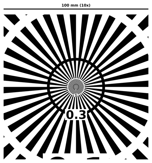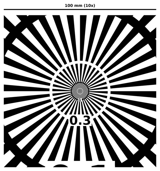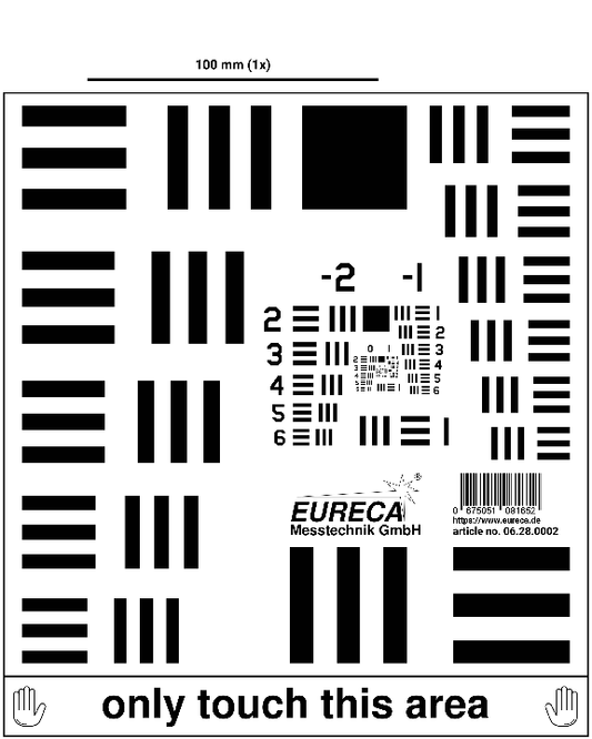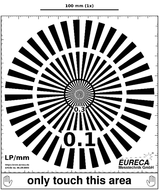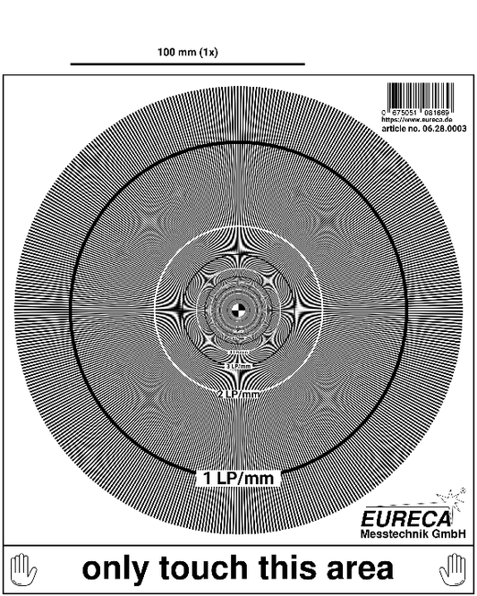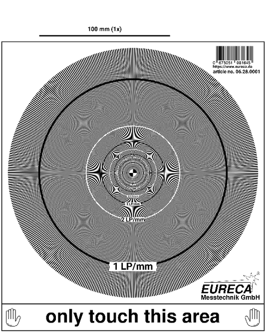Für die Beurteilung des Auflösungsvermögens von zum Beispiel Optiken und Kameras bieten wir Testtargets an, auf denen Teststrukturen mit unterschiedlicher Auflösung vorhanden sind.